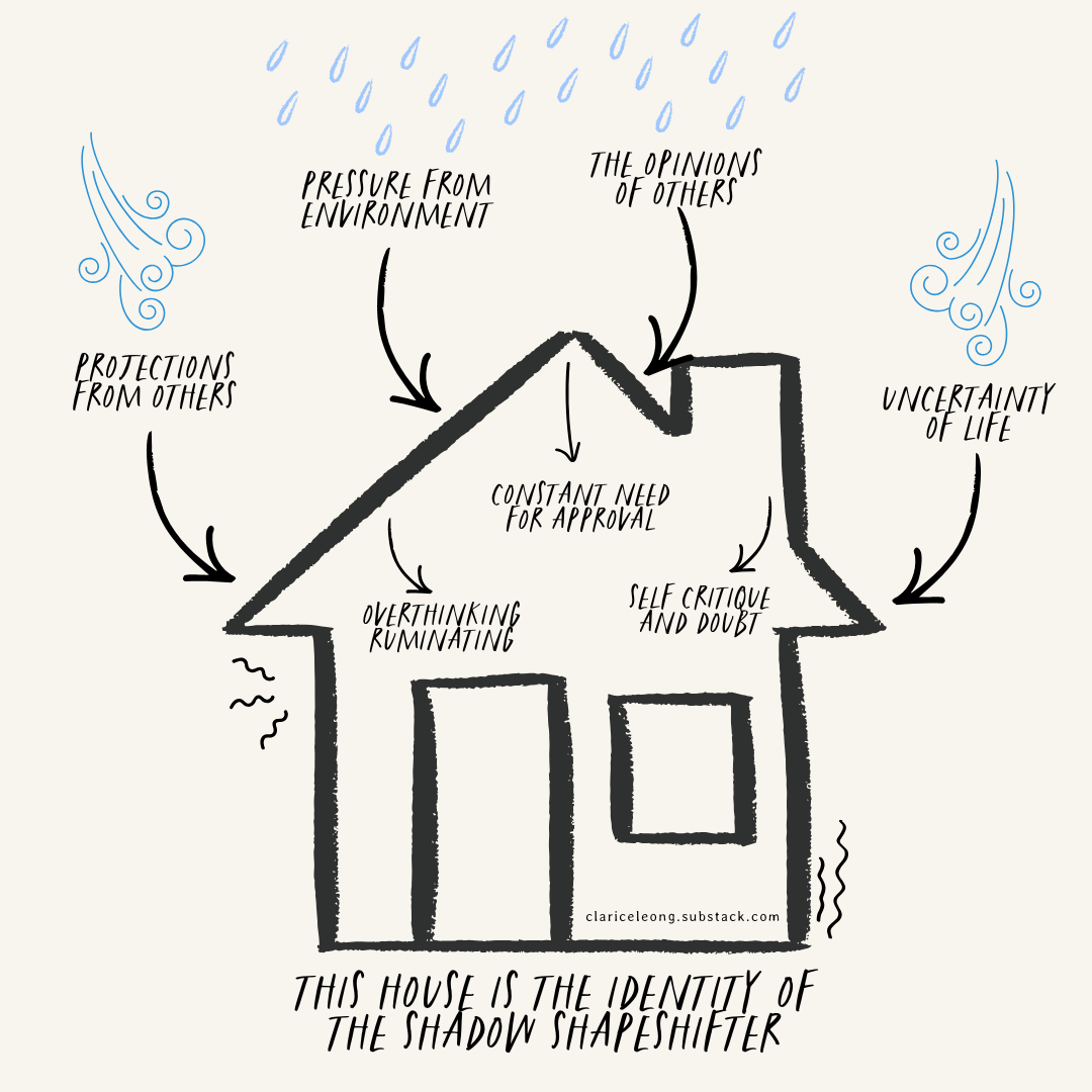 Without this Identity Structure, external forces – expectations from the world, circumstances, projections from others, etc – become too much to withstand. Think of this as a house made out of cardboard or straw that’s expected to withstand strong winds. The wind pushes into the structures of the house, and eventually it collapses from the weight of overthinking, self-critique, and the pressure to please.